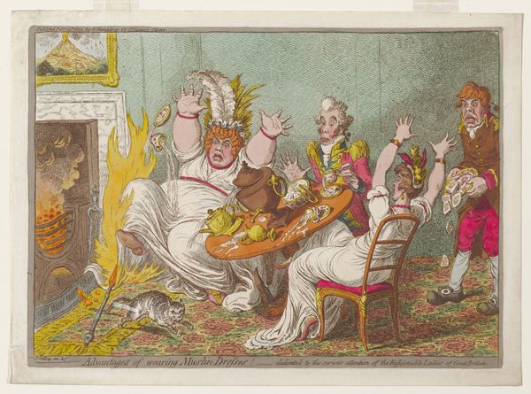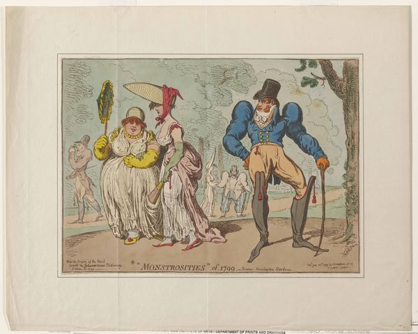 Editor: Here we have "Napoleon verkoopt gestolen goed," likely from 1813, a watercolor print by Thomas Rowlandson. The scene is chaotic, a kind of bizarre auction. What catches my eye is the clear imbalance, the way Napoleon dominates the composition. What do you make of it? Curator: Indeed, the asymmetrical arrangement is deliberate, guiding our gaze from the commanding figure of Napoleon to the frenzied crowd. Observe the lines: angular and sharp around Napoleon, contrasting with the almost comical roundness of some of the onlookers. How does this linear distinction affect your perception of power within the piece? Editor: It makes Napoleon seem rigid and imposing, almost inhuman compared to the more expressive crowd. So, you’re saying the form reflects the content, this idea of his authoritarian rule? Curator: Precisely. Moreover, consider the color palette. The artist uses muted tones, except for strategic pops of gold – note the crowns piled at Napoleon's feet. What does this emphasis on a single colour suggest in the context of an alleged selling of stolen goods? Editor: It draws attention to the wealth and power being acquired, perhaps even highlighting the decadence and greed associated with Napoleon's actions. The bright gold contrasts against the otherwise dull palette. Curator: A keen observation. It suggests that even in this tumultuous scene, the allure of wealth remains central. One may read a simple contrast or division between dull powerlessness and attractive power in this way. A certain irony pervades this cartoon because those are merely images. Editor: So, by analysing the formal elements, the artist is able to express meaning without even relying on the satire present in the print. Fascinating! I wouldn’t have noticed the strategic use of color if you hadn't pointed it out.