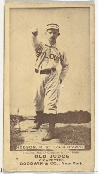 Curator: The sepia tones create a real sense of nostalgia in this piece. It's an 1888 photographic print by Goodwin & Company, from the "Old Judge" series. The work is entitled "William Frederick 'Bill' Krieg, Catcher, Minneapolis". Editor: It's remarkable how such a simple portrait conveys so much energy! The texture in the photograph adds so much depth. It also suggests a specific, palpable historical era. Curator: Indeed! These cards were originally produced as promotional items for Old Judge Cigarettes. Think about the manufacturing process – the printing, the card stock, the labor involved in distributing these with tobacco products. That accessibility democratized art, in a way. Editor: I'm intrigued by how the figure fills the frame. It is a formal technique, focusing our gaze entirely on Krieg and his stance; the focus emphasizes his readiness and physical prowess. There’s a careful composition at play that elevates it beyond mere documentation. Curator: Exactly. And that blurriness around the figure, the slightly out-of-focus background...it speaks volumes about early photographic techniques, but also the rapid industrial expansion defining America at the time. Mass culture in the making! These baseball players became icons of mass culture thanks to production processes like these. Editor: And consider Krieg himself, his uniform and posture... Semiotically, he represents a kind of idealized American masculinity that was rising to prominence, as we built new codes about sport, labor and national identity. Curator: It is a compelling argument. This card circulated thanks to tobacco consumption and, conversely, promoted idealized visions of success. Think about the distribution chains and consumer habits woven into the artmaking. Editor: Thinking about all this certainly changes my initial reading. It is a great example of how the aesthetics of the art are enhanced by their material history! Curator: Indeed, I came in looking for details related to manufacture and social conditions and the card opened up whole new interpretative fields to consider.