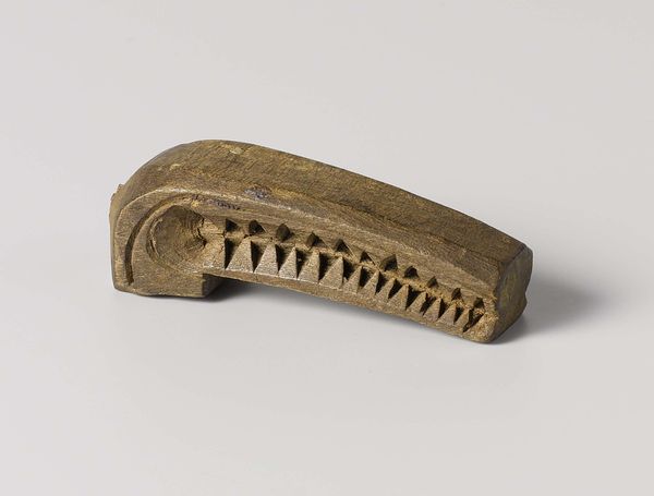 Curator: This striking wooden object, dating from possibly 1590 to 1597, is identified as a "Clock and gunpowder horn" and resides here at the Rijksmuseum. Editor: My first thought is that it looks rather austere, almost weathered. It gives the impression of having silently witnessed quite a lot! I am intrigued about this fusion between measuring time and, quite literally, explosive action! Curator: Indeed. It is an intriguing piece. We believe this gunpowder horn and the clock it likely accompanied highlight an interesting intersection of military readiness and emerging technologies. Consider that timepieces were still somewhat novel and not widely available. Editor: So this clock was a sort of prestige item, intertwined with war? It’s a bit like those fancy watches generals wear in movies – it whispers power, and access! Curator: Precisely. Its creation underscores not just the advancement of weapon technologies but also suggests a certain aspiration within military circles. It’s all about controlled efficiency. The measurement of time, coordinated actions. Editor: Control. That is the crux of this whole horn. Gunpowder, itself, needs mastering, contained. But putting the concept side-by-side with that of marking time—fascinating! How the desire to organize things really does extend into every niche of experience! Curator: Furthermore, objects such as this can reflect larger socio-political concerns of their period. The ongoing European conflicts required an efficient means for not only resource gathering but for troop coordination, strategy and above all, supply of weaponry. The piece showcases those values, literally. Editor: Thinking about gunpowder stored in wood… the horn itself looks remarkably sturdy. Was it standard or commonplace? Also what stories it would tell could it talk about who carried it…the hands that wielded the power! Curator: Examples of wooden powder horns survive within a certain frequency within collections internationally and yes, imagine where this object might have travelled! In considering how societies invested in art-making – either as propaganda or purely for leisure and beauty – objects related to technology reveal perhaps the deeper desires. Editor: This blending of technology and artistry provides an entry point into that complex era. Curator: Indeed, and that intersection remains so compelling still today.