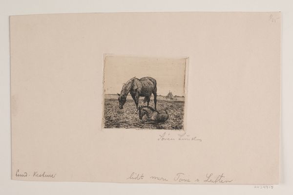 This is Søren Lund's "Cow," an etching on paper. The fine lines of the etching process lend themselves well to this subject. Lund used acid to bite into a metal plate, creating grooves that would hold ink, and then pressed the plate onto paper, resulting in this delicate, detailed image. The choice of etching is significant here. Unlike a unique painting or drawing, etchings allow for the creation of multiples, bringing art to a wider audience. This democratizing aspect aligns with the growing urban middle classes, and reflects an interest in a pastoral subject—a cow, chickens—representing the Danish countryside. The relatively small size of the artwork also makes it domestic, suitable for display in a middle-class home. Considering the context of the late 19th century, "Cow" speaks to the shifts in artistic production, labor, and the changing relationship between urban and rural life. It asks us to think about how new modes of production were shaping artistic expression and cultural values.