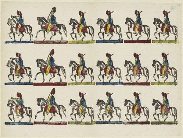 Glenisson & Zonen created this print titled 'Krijgsbeweging,' which translates to 'Military Movement,' showing a sequence of a horse and rider. The print's depiction of continuous motion relates to the emerging scientific and cultural interest in capturing and understanding movement in the 19th century. The artist, about whom little is known, seems to maintain traditional representations of military might and masculine power through the militarized figure on horseback. However, this artwork perhaps inadvertently reveals the theatricality of war and the performative nature of masculinity in the military. The print’s crude animation underscores how identity and power are not fixed but are constructed through repetition and movement, reflecting an emotional tension between the desire for stability and the reality of constant change.