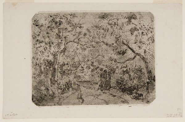 Curator: Well, what do you make of this small, intricate world? At first glance, "Landscape with Animals," feels a bit… hazy, like a memory half-forgotten. Editor: I agree. There's a beautiful density here. The composition immediately struck me as one that embraces enclosure; the layering of the trees, the arrangement of animals... it evokes a profound sense of intimacy, and even a kind of comforting darkness. Curator: That density is all thanks to Charles Jacque’s remarkable etching technique. What's amazing is that there isn’t a determined date for this. Yet you know it must have been born of the artist's quiet observation, wouldn’t you agree? He wasn't just depicting animals but the life they carved out for themselves. Editor: Precisely. The foreground and background feel like intentionally constructed stages, demarcated through varying levels of detail. The animals near the water’s edge are crisper, almost sculptural, inviting direct engagement. But as your gaze ventures further in, the etched lines seem to dissolve into a tapestry of abstract impressions. It's fascinating. Curator: And I find that lack of sharp focus gives the whole piece an extraordinary evocative quality, even. These figures and that little architecture are all suggestions, impressions of being… in a landscape, which in turn makes me feel quite at peace, oddly enough. Like it reminds me to be at ease with just *being*. Editor: Absolutely. It reminds us that an etching such as this relies so much on the relationship between ink and negative space, mass and line. But I'm left wondering about the lives of these particular animals. Do they reflect something larger, maybe the tranquility Jacque yearned for himself? Curator: Possibly. Or perhaps it's just a love letter to the humble, everyday beauty of the countryside. Whatever it is, this etching definitely encourages us to linger a little longer, doesn’t it? Editor: Without a doubt. Thank you for highlighting Jacque’s subtle landscape; I feel enriched by seeing this rural idyll through his thoughtful lens.