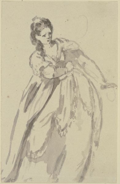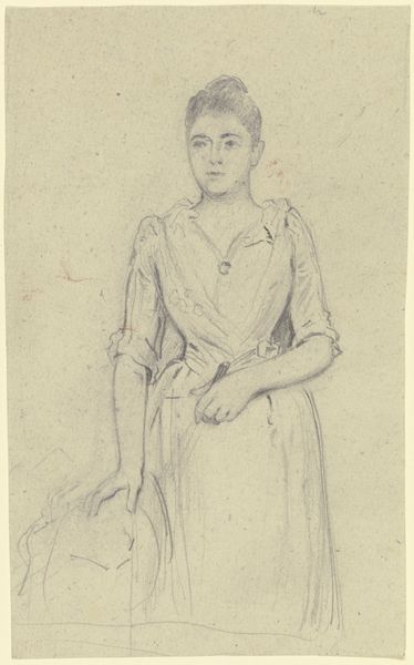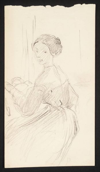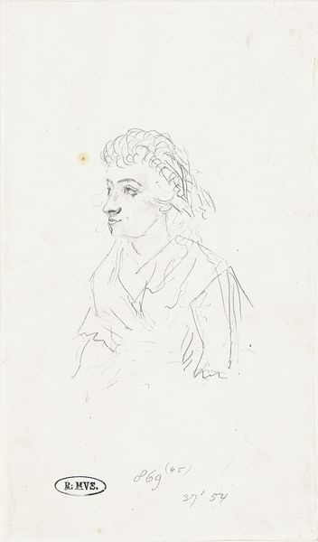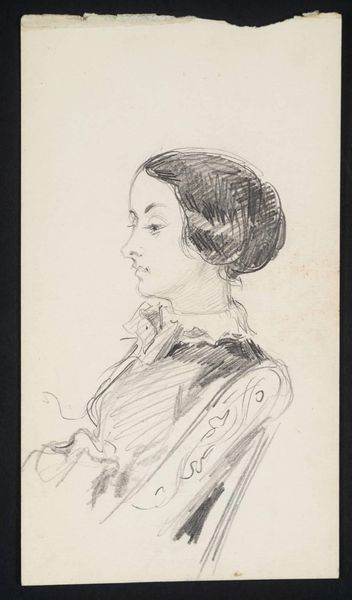 Wilhelm Marstrand created this profile portrait of a young woman using graphite on paper, employing the swift, direct mark-making characteristic of drawing. The linear quality of the graphite lends itself to capturing the subtle contours of the woman's face and form. The texture of the paper also plays a significant role, offering a slightly rough surface that catches the graphite, creating nuanced shading and depth. Marstrand's technique involved building up layers of graphite to define the woman's features and clothing. This kind of drawing aligns with a long history of preparatory sketches and academic studies in fine art. Yet the immediacy of the medium also suggests a more personal, intimate engagement with the subject. The relative simplicity of the materials belies the skill required to produce such a lifelike representation, reminding us that even the humblest materials can be elevated through the artist's touch. Understanding the choices of material, making, and social context helps us see beyond traditional distinctions between fine art and craft.