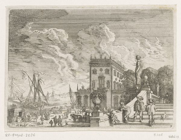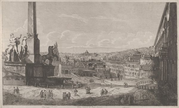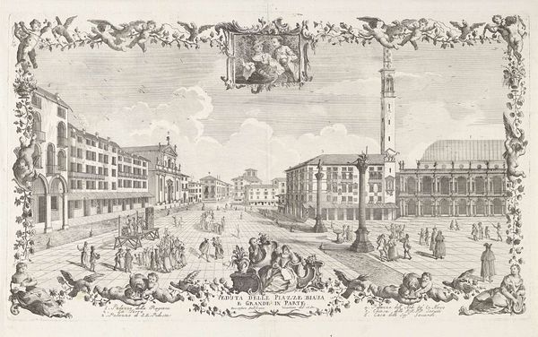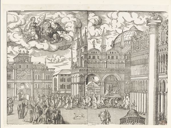 Curator: This is "View of the Piazzetta in Venice" created between 1590 and 1632. This engaging cityscape comes to us via Pieter de Jode I and his mastery of etching and engraving. Editor: The immediate impression is one of airy grandeur, achieved with delicate lines. The balance in the composition, those vertical lines of the campanile and columns, almost act as a grid, providing structure amidst the detailed figures. Curator: Exactly, it’s a compelling use of line. The textures – from the billowing clouds to the patterned facades – result from an intricate web of precisely placed marks. See how the artist manipulates light and shadow to suggest depth? Editor: Indeed. The scene pulses with recognizable symbols: The winged lion of St. Mark perched atop the column represents the city’s patron saint. This is more than just a depiction of a place; it is a symbolic portrait of Venetian power. It reinforces Venice’s self-image as a strong, divinely favored republic. Curator: Precisely. The organization of the space subtly guides the viewer’s eye toward the Basilica of San Marco in the distance, enhancing a feeling of receding perspective while also accentuating spatial relationships. Editor: And look at the figures populating the scene; they hint at Venice's global reach and busy, robust commerce. These carefully included details reflect a self-assured culture proud of its civic rituals and trade links. The statues in the lower corners reflect triumph. Curator: An excellent point. By positioning those allegorical figures so prominently in the foreground, de Jode integrates classical motifs within a decidedly contemporary cityscape. Editor: Studying the imagery provides a deeper connection with Venice's past—its enduring myths, emblems, and claims to distinction as a center of trade, art, and civility. Curator: Analyzing this engraving exposes just how much information about artistic choices can be conveyed through formal elements. Editor: Yes, examining recurring icons of the era alongside careful composition reveals aspects about the culture in which this piece was created.