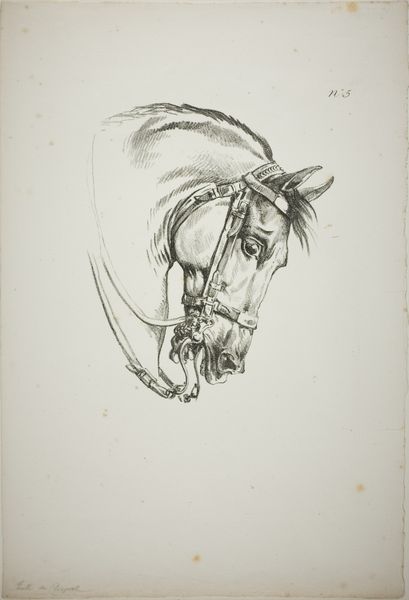 Curator: Welcome. Here we see "Paardenhoofd met wapperende manen, naar links," which translates to "Horse's Head with Flowing Mane, Facing Left," created by Joannes Bemme before 1841. It’s a pen drawing. Editor: The immediate feeling is... unrestrained energy, almost a raw, visceral spirit trying to break free from the page. The stark contrast and the rough lines give it an unfinished feel, very immediate. Curator: It's interesting you say unrestrained energy, because for me, horses often symbolize freedom, power, but also servitude, given their long history alongside humans in agriculture, warfare, and transportation. Bemme’s decision to portray just the head invites us to consider these complex associations. Editor: Yes, there’s an inherent contradiction there, isn't there? The 'freedom' you speak of, that primal symbolism of the horse is complicated by its obvious taming, its being harnessed by human intervention. What do those chains signify within the context of that freedom? Control, domestication, broken will? Curator: The bridle definitely hints at that duality. Think of classical equestrian portraits, how they typically showcased the rider's dominance. This sketch offers a starkly different perspective, focusing on the animal itself. Editor: What does the artist try to capture by rendering this single view of a creature that represents, as you put it, the push-and-pull of animal autonomy and the dominion imposed on its very nature by humans? The image makes me reflect on animal rights in modern contexts, on historical exploitation... Curator: Absolutely, it provokes those uncomfortable reflections. This drawing could symbolize the struggle for liberation in other contexts too. It resonates with a deep understanding of subjugation. I wonder, if this horse could speak, what stories of past battles and journeys would it tell? Editor: It's interesting to see how a seemingly simple sketch, can, on the other hand, expose layer upon layer of symbolic relevance, extending all the way from early animal taming, up to discussions around current animal exploitation and autonomy issues. Curator: Indeed. It demonstrates the timelessness and multifaceted quality inherent in art, its ability to act as a persistent carrier of both culture and emotion across generations.