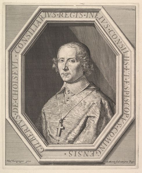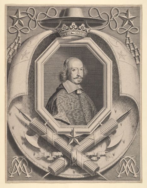 Editor: This is Robert Nanteuil's engraving of Cardinal Jules Mazarin, created in 1659. The portrait itself feels pretty conventional for the time, but it's framed by this almost wallpaper-like field of stars. What's your take on how the social climate influenced the creation and reception of this piece? Curator: The backdrop is not mere decoration. It directly addresses the politics of image. Mazarin was a deeply unpopular figure, a foreigner wielding immense power in France. Nanteuil, as his appointed portraitist, was tasked with crafting an image, a symbol of authority, that would circulate widely. The stars, think about them – suggesting not just status, but almost a divinely ordained right to rule. Editor: So, the stars are a deliberate effort to rebrand Mazarin's image? Make him seem less like a scheming politician and more like... a celestial leader? Curator: Precisely. Engravings like this weren't just art objects; they were political tools. Think of them as the early modern version of propaganda posters. The printmaking medium also ensured wide dissemination. Who do you think would consume this image and where might it have been displayed? Editor: Maybe wealthy citizens, officials… It’d be in government offices, perhaps private collections of those wanting to show loyalty? It's interesting how the meaning is tied to the social function. Did it work, this star-studded campaign? Curator: History is complex. While Nanteuil produced a technically superb image and the print circulated, resentment towards Mazarin remained. Art can shape perception, but it doesn't exist in a vacuum. It's a reminder that images are active participants in the power dynamics of their time. Editor: I never really considered portraits as propaganda before. Thinking about the intended audience and the political messaging makes it so much more layered.