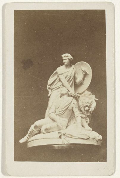 This is Johannes Hinderikus Egenberger's 1868 photograph of a model for a monument commemorating the Battle of Heiligerlee. Here we observe the visual rhetoric of 19th-century nationalism and its intersection with gendered allegory. The photograph captures a small-scale model, likely intended for a much larger public monument. At its base, we see a figure representing the Dutch Maiden who is a symbol of the Dutch state and its values. She stands protectively over a fallen soldier. The monument evokes a sense of patriotic duty but also grief and sacrifice. It reflects the period’s investment in creating national identity through historical narratives and monuments. The Dutch Maiden embodies virtues of strength, resilience, and moral purity. Consider how the monument would have functioned in public space, shaping collective memory and reinforcing national identity. It invites us to reflect on the ways societies choose to remember and represent their past, and whose stories are privileged in these processes.