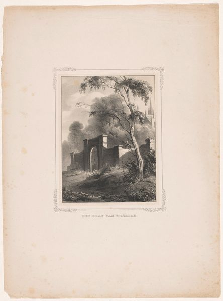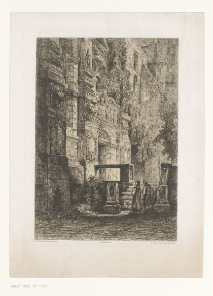 Léopold Flameng created this print, "Remnants of the wall of Philip Augustus with a gardener working in front," using etching. It's interesting how Flameng situates a common laborer, a gardener, against the backdrop of the old wall of Philip Augustus. This wall, once a symbol of power and protection, is here presented as a ruin, a relic of a bygone era. The gardener becomes a figure of the present, diligently working amidst the remnants of history. There's a sense of melancholy in the depiction of the wall, overgrown and crumbling, and one wonders what Flameng, who lived through the Franco-Prussian War and the Paris Commune, was thinking about the relationship between progress, labor, and the past. The gardener, in his quiet labor, perhaps symbolizes resilience and the ongoing cycle of life amidst the ruins of history.