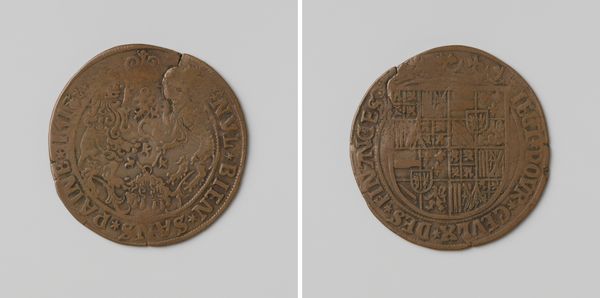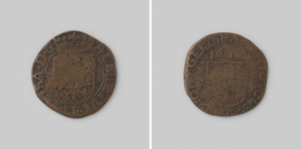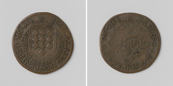 Editor: Here we have "Hoop op vrede," or "Hope for Peace," a metal print from 1639. Looking at it, the texture and detail, particularly on the coat of arms, is so impressive, despite its small size. How should we interpret this piece within its historical context? Curator: Precisely. The Estates de Lille issuing this medal speaks volumes. Consider Lille's position during the 17th century. It was a strategic territory, caught between warring European powers, deeply implicated within histories of colonial competition, dynastic squabbles, and shifting trade dynamics. How does understanding this context shape your perspective on the artwork? Editor: It makes me think about who this “hope” was for and who was included or excluded from that hoped-for peace. Were these emblems meant to reassure the ruling class? Curator: Exactly. These medals often functioned as propaganda, shaping public perception and legitimizing power. Do you see how the imagery and inscription reinforce this? Consider who would have access to these objects and what messages they convey about social hierarchy and the promise of stability amid conflict. What ideological purpose might these have served? Editor: So it is an art piece embedded in politics, then. I guess I was too quick to judge the historical meaning. Now I understand more, thanks! Curator: Precisely. Examining historical objects necessitates critical analysis. By engaging with this object and thinking about its meaning within that complicated historical context, perhaps we can begin to examine assumptions that may have perpetuated inequalities. I, too, will reflect further.
