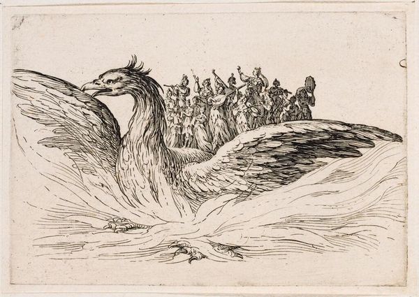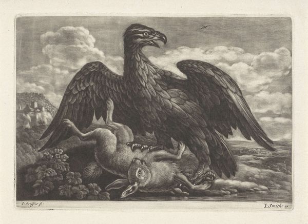 Editor: This striking engraving by Francis Barlow depicts an eagle clutching a snake. It feels like a real power play, all those sharp lines creating so much tension. What do you make of this image? Curator: For me, it’s like glimpsing into the anxieties of Barlow’s time. The eagle, traditionally a symbol of power, confronts the serpent, often associated with deception or chaos. It's a dance of order against disorder, no? The funny thing is, are we sure who's winning? Editor: I see what you mean. It's not just a straightforward victory. Curator: Exactly! It leaves you wondering what Barlow truly believed about the balance of power. Food for thought, indeed! Editor: Definitely gives a lot to consider. I'll never look at an eagle and snake the same way!