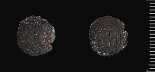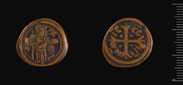 Curator: Here we have a replica of a 7th-century Merovingian Round Fibula, its original maker remains unidentified. Editor: It's quite small, only about an inch and a quarter in diameter, yet the composition feels so balanced and full of symbolic suggestion. I'm immediately drawn to its aura of cultural exchange and adaptation. Curator: The bilateral symmetry evokes a sense of order, but the rough execution lends it an earthy, almost primal quality. The imagery of stylized figures flanking what looks like a tree definitely speaks to pre-Christian motifs finding new life within Merovingian culture. Editor: Absolutely. The figures themselves, possibly animals or human-animal hybrids, could be interpreted as guardians of the tree, a common motif in many indigenous European spiritualities that persisted even after the rise of Christianity. Curator: The 'tree' itself, with its lattice-like trunk, reminds me of earlier Celtic knotwork, carrying forward a sense of interwoven destinies, of connection. The fibula, then, serves as a potent symbol of continuity amid change. Editor: It's a quiet but powerful testament to the ways societies adapt and reinterpret older beliefs. It underscores how objects like this carry not just aesthetic value, but also narratives of cultural resilience and transformation.