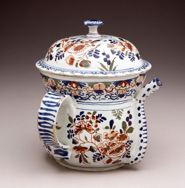 Editor: Right in front of us we have a Teapot, from around 1760, crafted by the Staffordshire Potteries. It's made of ceramic. Gosh, what catches my eye is just how cheerful and whimsical it feels – like a burst of spring. I wonder, what strikes you most about this piece? Curator: Whimsical is absolutely the word! For me, it’s the conversation between the wild profusion of color and the disciplined form. See how the handle and spout are almost like branches, reaching out? They suggest a wildness contained – almost like taming a little piece of nature itself. What does 'tea' bring to your mind? For me, it is like meditation - just the vessel's look makes you happy. Editor: I hadn’t noticed the branches before! I was so caught up in the riot of colours. Is this the influence of Rococo? I keep picturing Marie Antoinette drinking tea out of something like this. Curator: Absolutely Rococo! But think a bit beyond pure courtly excess, because this piece was made for a market hungry for these new vibrant colours, keen for beautiful objects to bring colour into daily life. Staffordshire was a hotbed of experimentation; imagine these potters, pushing the boundaries, firing after firing, figuring out how to get those dazzling shades just right. The green feels quite vibrant in my eyes. Doesn’t it make you just want to see a garden? Editor: That's such a good point – democratizing beauty. It's not just for royalty; it’s for anyone who wants to bring a little joy into their afternoon tea! I'll never look at a teapot the same way again. Thanks so much. Curator: And I realize this wasn't just about artistry - the global appetite for tea spurred innovation and creative problem solving, didn't it? A good brew to you!