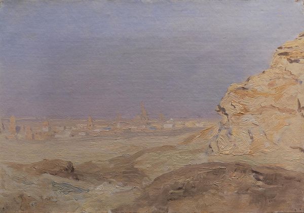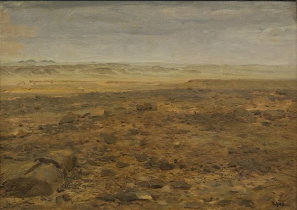 Editor: This is "Supreme Court," painted by Polychronis Lembesis around 1880, rendered in oil on canvas. The palette is all earth tones, lending a sort of sun-drenched atmosphere, with imposing rocks dominating the composition...What's your take on it? What stories do you think it could be telling? Curator: Stories? Oh, this painting whispers tales of resilience, doesn't it? It reminds me of childhood summers, squinting at ancient ruins, imagining the lives played out on those very stones. Look at how the light caresses those weathered rocks – feels like centuries of secrets etched onto the canvas. I'm really drawn to those goats too. Are they the stoic witnesses of forgotten empires? Editor: Stoic goats! I love that image. It's true; they feel like part of the landscape. But what about that lone figure to the right? What do you make of him? Curator: Ah, the lone wanderer! Perhaps he's seeking enlightenment among the ruins, a seeker lost in thought. Or perhaps he is just a goatherd bringing these ruminant storytellers home! Lembesis is a clever one – letting us decide, isn't he? It really makes you wonder if the title itself, "Supreme Court," is maybe a little ironic? Editor: I see what you mean; it’s certainly not the formal image of justice one might expect! But with the ruins, maybe it's suggesting justice evolves, erodes even, like those stones... Curator: Precisely! So, what is your new idea of the title and your impression of the painting? Editor: Now that you mention it, the painting now suggests that everything changes. Even "supreme" concepts like justice can decay... Thanks, I will carry these "stoic goats" forever now! Curator: Well, Editor, your journey will be an adventure.