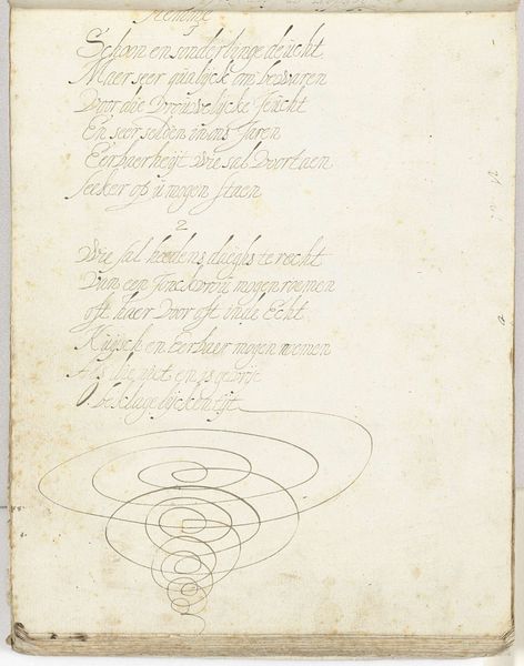 Curator: Here we have a religious poem, dating from around 1646 to 1650, created by Gesina ter Borch. The Rijksmuseum holds this drawing, executed in ink and watercolor on paper. Editor: It’s delicate. My immediate feeling is one of introspection, almost whispered. The off-white of the paper feels like aged parchment, lending a sense of historical weight. Curator: Ter Borch came from a family deeply engaged in artistic and intellectual pursuits; the poem and her other artistic creations serve as primary source texts to explore female identity in 17th-century Netherlands. Her artistic journey deserves to be contextualized within the burgeoning print culture and rising literacy among women of her time. Editor: Visually, the cursive script feels almost ethereal, doesn’t it? Like pale smoke against the aged page. The swirling lines at the bottom seem less deliberate, more like automatic writing or perhaps a decorative flourish? Are those perhaps representative of life's cyclical nature? Curator: It could be interpreted in multiple ways. Considering the socio-cultural backdrop, ter Borch and women of her standing were permitted and encouraged to engage in spiritual exploration and contemplation—literacy for some provided ways for self-expression, though very privately. In many cases their creativity or agency did not extend beyond these confines, hence works like this may hold greater resonance if viewed through that lens. Editor: Indeed. Knowing the historical framework elevates the visible symbols—the curves of the letters, the embellishments—transforming them into silent carriers of suppressed desires, of intellectual yearning veiled in religious practice. Curator: Precisely. It also helps to break apart traditional patriarchal narratives and understand female subjectivity during the Golden Age of Dutch art, seeing it for its nuances. Editor: I leave with a renewed understanding. Beyond being aesthetically captivating, this religious poem functions almost like a palimpsest—a space where personal faith, societal constraints, and artistic expression merge in subtle but profoundly moving ways. Curator: Agreed. The poem transcends being just a piece of religious ephemera and becomes an artifact for complex, intersectional understanding of a unique voice and lived experience of a 17th century woman.