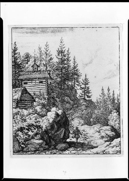 Curator: Looking at "Village Carpenter" by Allart van Everdingen, I immediately get a sense of rugged self-reliance. What strikes you first? Editor: That sense of isolation, actually. The sharp lines and stark contrasts lend a feeling of scarcity and the labor needed to survive in that landscape. Curator: Certainly. Everdingen was known for his landscapes, often depicting scenes with a focus on labor and everyday life. The scene here tells a story about rural work. Editor: It's the composition that gets me. The carpenter is small, almost dwarfed by the landscape. It highlights the relationship between the individual and the natural world, perhaps even a sense of struggle. Curator: Right, and within the socio-political context, this could also reflect the realities and resilience of the working class. Editor: Absolutely. The etching provides a lens to view historical labor practices. I wonder if we can look at it to better understand the roots of inequality. Curator: It provides an engaging historical and artistic commentary, doesn't it? Editor: Indeed. I'm left thinking about the ongoing challenges faced by laborers worldwide.