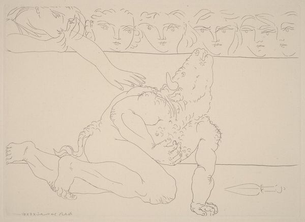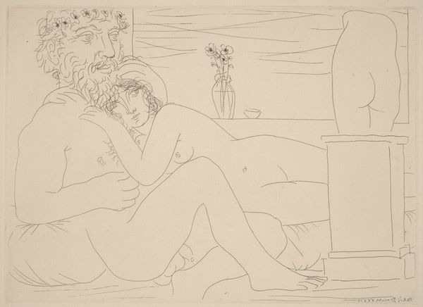 Editor: Here we have Picasso’s "Sculptor Reclining with an Unmasked Model and Her Sculpted Representation" from 1933. It’s a drawing or print, and the thing that immediately jumps out at me is the incredibly spare use of line to define these figures. How do you interpret this work through that formal lens? Curator: Indeed. Note how the artist exploits the economy of line. Observe the purity and directness, how each contour strives for autonomy yet functions interdependently. We discern, via compositional strategy, a fragmented tableau. Consider the implied spatial relationships, almost cubist, through mere juxtaposition of the figures rather than classical modeling or perspectival illusionism. Editor: I see what you mean about the almost cubist space; the figures are distinct, and the relationships seem psychological, not strictly physical. It’s as if they are coexisting in one canvas yet have no true relation with one another. Curator: Precisely. Examine how the lines delineate mass while denying it true volume, an intentional paradox that stimulates intellectual engagement beyond simple observation. How does this flatness challenge our reading of the work as narrative or allegory? Is it simply line that generates forms for line’s sake alone? Editor: It pushes me away from reading this image as an intimate scene to seeing it as a study of line and form—almost a diagram about bodies in space rather than bodies themselves. So it comes across as a formal exercise. Curator: An astute observation! The lack of traditional rendering propels us toward contemplating the line itself, as an aesthetic object devoid of referential weight, in which case the narrative dissolves into purely structural relationships. Editor: So, looking at it that way makes the flatness and sparseness less of a deficit and more of a method of making you think about line itself as form. Curator: Precisely. One now observes that even supposed negative space is vital. Editor: That makes sense. Thanks.