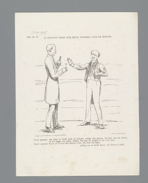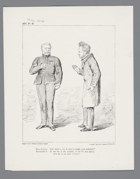 Here we see a lithograph from 1875 by Johan Michaël Schmidt Crans, a satirical commentary on speeches in the Dutch Second Chamber against Dutch citizens who served as Papal Zouaves. The composition divides the scene into distinct zones, separating the figure of the Zouave on the left from the politicians on the right. The Zouave, rendered with detailed hatching, is depicted in a state of leisure, smoking, which contrasts sharply with the agitated gestures of the politicians. The stark lines and monochrome palette contribute to the print's didactic tone, underscoring a pointed critique. Crans uses the formal structure of the lithograph to create a visual rhetoric, subtly questioning the moral and political positions of his subjects. The exaggerated expressions and postures of the politicians, coupled with the nonchalant air of the Zouave, function as signs within a semiotic framework, inviting us to decode the underlying cultural and political tensions of the time. In this way, Crans's print serves not merely as a historical record, but as an active intervention in the debates of his era.