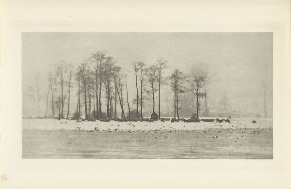 Curator: This artwork is titled "Gezicht op een verijst water, waarop mensen met klompen en schaatsen. Boten en een kerk op de achtergrond", which translates to "View of frozen water, on which people with clogs and skates. Boats and a church in the background.” The piece is by an anonymous artist, dating from before 1905. Editor: There’s a striking sparseness to this scene; the washed-out sepia tones and wide open space convey a palpable sense of cold and solitude. The arrangement of the figures feels almost accidental. Curator: Indeed. Anonymous artists of this era often depicted everyday life to document it for future generations. You can see the rigid class structures within the town. The composition frames the townsfolk amongst their sources of living and worship to cement the impact of the church. Editor: Notice the light—it’s almost as if the figures are being bleached of their individuality under the winter sky, flattened into silhouettes. The variations in tonal depth—the darks of the boats, the light of the church—work to balance the flatness of the scene overall. Curator: That’s very astute. Considering the socio-economic position of most artists then, a work like this also functioned as a testament to the shared human experience, normalizing leisure activities for all classes amid rapid industrial change and social upheaval. Winter festivals united the country during dark times. Editor: It is an interesting social document; its power resides not just in its visual record, but in its ability to evoke mood through basic tonal contrasts and understated forms. Curator: These snapshots of commonplace activities also served to boost civic morale and create shared nostalgia among viewers during an important point in our social timeline. Editor: So it goes beyond its immediate depiction into the symbolic and cultural realm? Food for thought... Thank you. Curator: An interesting analysis. Thank you.