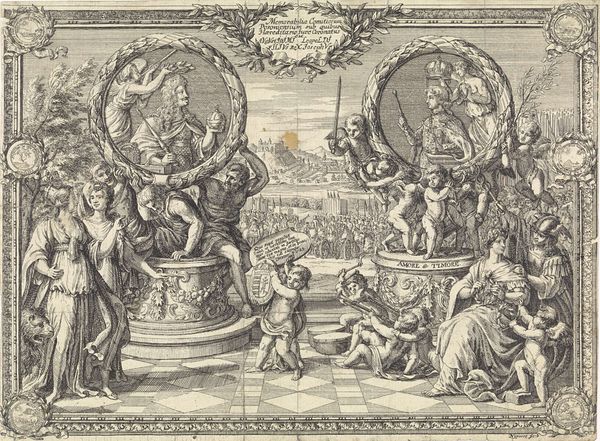 Curator: This print, titled "Man Kneeling Before a Throne in a Large Hall", was created by Jacobus Schijnvoet sometime between 1704 and 1733. Editor: My immediate impression is one of Baroque opulence. Look at the textures created purely through line work – the velvet of the throne, the satin robes, even the rough stone of the architectural details! It’s astonishing. Curator: Absolutely, the line engraving is remarkably detailed. Consider the socio-political context: prints like this were powerful tools, used to disseminate allegorical messages about power and governance throughout society. Note the Latin motto at the top – how does it reflect power dynamics and virtue of rulers at that time? Editor: Indeed, it underscores the concept that a ruler's ability to give – both materially and in justice – is a key to their authority. We need to remember, engravings weren't just aesthetically pleasing; they were produced en masse to propagate specific ideologies within the public sphere. Think of the labour, the printing presses, the network needed for distribution! Curator: And consider how institutions played their part! Works like these ended up in print collections of aristocrats, libraries and served as political commentary circulating within elite circles influencing policy. Editor: That's the interesting contradiction – an art form created to transmit power through readily made available material forms, ended up largely only enjoyed by a restricted part of society. Curator: That highlights the complex role of art. It reveals intended uses and the unintended consequences that historical, social and class context create. Editor: Examining prints like these helps us unravel power dynamics and the construction of legitimacy in that time. Curator: A tangible link to past ideologies, mass produced, available in collections, constantly reproduced!