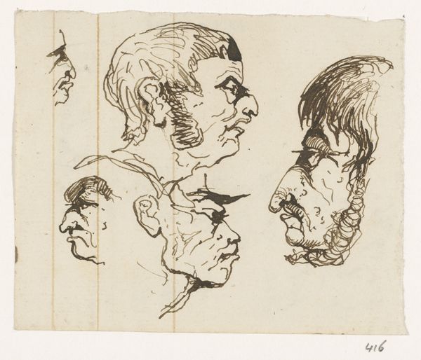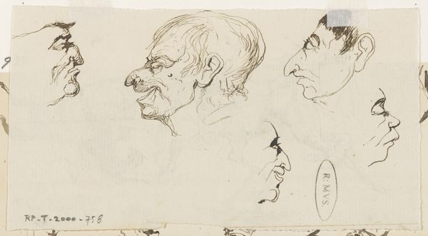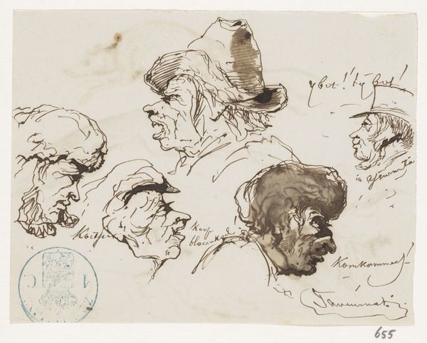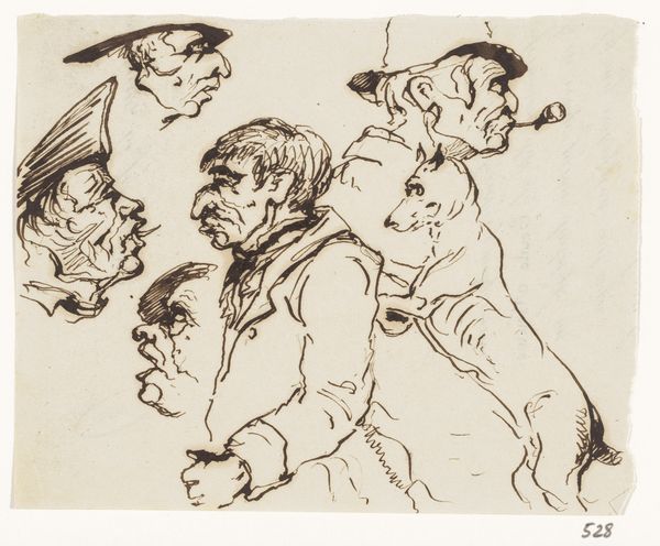 Editor: Here we have "Koppen en een haas," or "Heads and a Hare," a drawing made with ink and pencil by Johannes Tavenraat, sometime between 1840 and 1880. I’m struck by how informal this feels, like a page torn from a sketchbook. What stands out to you in this composition? Curator: The rapid, almost frenetic, application of line is paramount. Notice how Tavenraat uses hatching and cross-hatching not to define form in a traditional, volumetric sense, but rather to create a dynamic interplay of light and shadow, texture and void. Observe the tension created by the varied weights of the lines, a sophisticated interplay of dark and light, which, irrespective of representational skill, yields tonal effects. Editor: So, it's the relationship between the lines themselves, more than the figures they depict? Curator: Precisely. Consider how the orientation and direction of each stroke contributes to the overall dynamism. The hare, for instance, isn't simply rendered; it’s energized by the radiating lines implying motion. Look how it jumps. Further consider the positioning of these ‘heads’, where we read them in relation to one another in a matrixial ordering that defies spatial conventions. Editor: I see what you mean. The placement seems less about creating a realistic scene, and more about how each element interacts on the page itself. I find it's all more lively when observing line as energy and relation as opposed to static forms and shapes! Curator: Indeed. A formal analysis shifts our perception away from simple mimesis. The ink and pencil are media with intrinsic qualities: their capacity for texture, their responsiveness to pressure. Editor: So, understanding Tavenraat's technique reveals more about his artistic choices, and consequently informs the work’s visual character and meaning. Curator: It reveals a concentration on material essence and the act of mark-making, above all else.