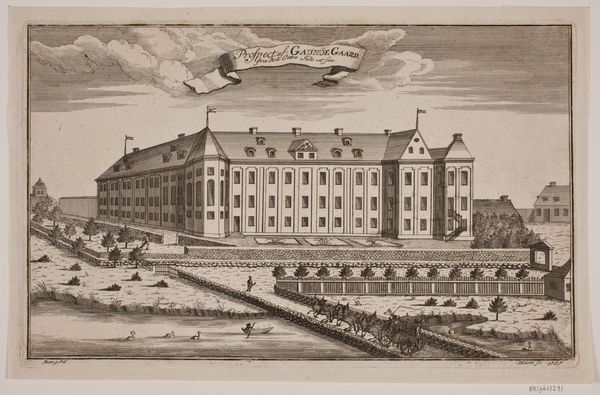 Curator: What a scene! It evokes a serene almost wistful feeling, doesn't it? Editor: Definitely! I’m immediately struck by the detailed craftsmanship. We are looking at "Lutherse Diaconiehuis te Amsterdam," a print, likely an etching or engraving by Carel Frederik Bendorp, created around 1790. Notice the precise lines, the carefully rendered architectural details of the building and bridge...it speaks to the skill and labor involved in its creation. Curator: Skill, yes, but also sensitivity. The subtle coloring and the arrangement of the figures… they're not just placed there; they're like musical notes in a quiet composition. I find the open sky calming. Editor: And let's consider the material reality – ink, paper, metal plates, the press… These aren’t just passive ingredients, they define the very texture of the image. I wonder how many impressions were made and who would have consumed these images? Were they commissioned, mass-produced for sale, or souvenirs for tourists visiting the Diaconiehuis? Curator: Hmm, questions worth exploring. The building itself dominates. Yet it doesn't feel imposing, but rather humane, approachable, maybe even hinting at the social support offered within its walls, what with the Lutherse Diaconiehuis being a type of care or almshouse. It sparks curiosity, at least for me! Editor: True. And if you zoom in, you'll see the social fabric meticulously stitched in – carriages suggesting wealth and trade, laborers reminding us of the city’s dependence on physical labor. Bendorp presents a structured view of the economy. Curator: Structured indeed! I still marvel at how the composition feels spacious yet intimate at the same time. It allows us to daydream our way into 18th-century Amsterdam, you know? Editor: I suppose it is fascinating how printmaking democratized image consumption during this period. So what remains are ghostly apparitions of the means by which things once operated. Curator: An excellent point—and such a paradox. Art offers this magical entry point into other eras while always holding up a mirror to our own… Well, thanks for adding these layers! Editor: My pleasure. Thinking about art as part of the machinery of the time – there is an allure in that for sure.