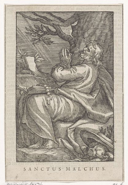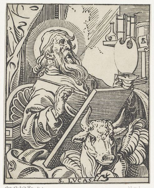 Editor: So this engraving, “Lucas de evangelist” by Antoine Sallaert, made sometime between 1590 and 1650, presents Saint Luke with his traditional attribute, the ox. It strikes me as a fairly straightforward, iconic representation. How do you interpret this work, beyond its obvious symbolism? Curator: Well, I see more than just a straightforward depiction. Let's consider the context. During this period, religious imagery was deeply intertwined with political and social power. This image, appearing after the Reformation, carries a complex weight. How does the artist use the visual language to either reinforce or subtly question existing hierarchies? Notice how Luke is actively writing. Editor: Yes, he's holding a quill, poised to write. Curator: Exactly! Consider the implications of literacy and the dissemination of knowledge during a time of religious upheaval. Who has access to the word? How is it being interpreted and controlled? Is this image promoting individual engagement with scripture, or reinforcing the authority of the church through Luke’s divinely inspired writing? Also, let’s consider that animals in art often represent complex power dynamics. What did it mean to pair Luke with an Ox during the time that the print was made? Editor: That's fascinating. I hadn't thought about the accessibility of the scripture aspect and the role of the Saint as a vessel between God and ordinary people. The placement of the Ox creates such a visual and intellectual statement. Curator: Precisely. By analyzing the historical, social, and even philosophical underpinnings of what seems like a simple religious image, we start to uncover deeper meanings about power, knowledge, and representation. Editor: Thank you for your expertise, I now feel as though I am approaching it from a different, and more complete perspective. Curator: The pleasure is all mine, and I too have learned a lot today. Keep questioning the narratives presented to you; the most profound insights often lie beneath the surface!