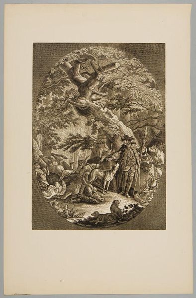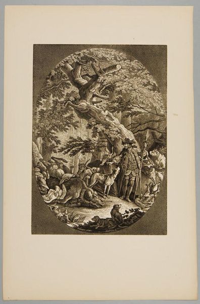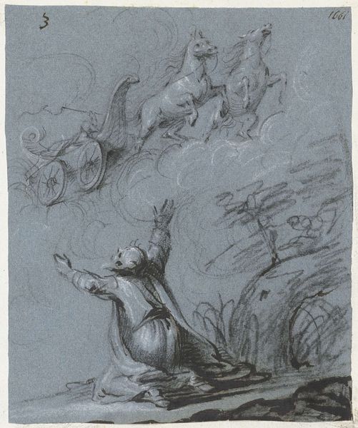 Curator: Well, this piece is an etching by Johannes Glauber, made sometime between 1670 and 1726. The title translates to "Phaeton asks his father for permission to drive the sun chariot". Editor: Ah, Phaeton! Talk about youthful hubris. Even in monochrome, the whole scene has a rather… unstable energy. A swirling baroque daydream gone slightly sour, perhaps. Curator: Indeed. The composition is a clear articulation of baroque aesthetics; observe the dynamic arrangement, figures thrust forward into the viewer's space, enveloped by an almost theatrical cloudscape. Consider, also, the implied diagonals that structure the narrative tension between Phaeton and his father, Phoebus. Editor: Diagonals are doing overtime here. I love the scratchy texture—makes me think of an impatient charcoal drawing. Everyone's on a cloud, practically vibrating. And the sky seems less divine and more like impending doom! Do you think that texture lends an allegorical complexity here? The technique speaking of a flawed, almost dangerous ambition? Curator: The artist’s deliberate use of etching enhances that interpretation. Line weight varies considerably; notice how Glauber renders depth— areas receding are suggested by lighter, more delicate lines while areas that advance show more pronounced lines. The contrast suggests an active instability in the very nature of ambition. Editor: An instability well-deserved, knowing how Phaeton's joyride ends. It is amazing how a piece rendered mainly in tonal contrasts, captures something deeply unsettling in his subject. Curator: Agreed. A work such as this allows us to view the past not only as art history, but, moreover, consider art's capacity to reveal a symbolic interplay of power and human aspiration across eras. Editor: Right. And hopefully, to learn a lesson about not letting teenage children drive the sun. On that note, off to face the fiery trials of the coffee machine.