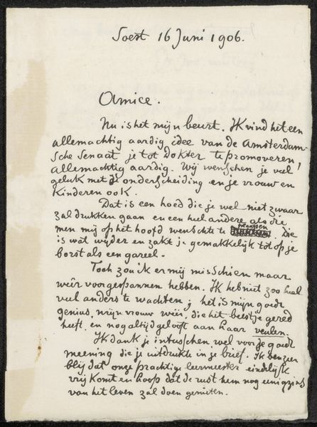This letter was written by the Dutch artist Antoon Derkinderen, likely in the late 19th or early 20th century. It gives us a peek into the social circles of artists at the time. The letter is addressed to Pieter Haverkorn van Rijsewijk, who was the director of Museum Boijmans in Rotterdam. The informal tone suggests a close friendship or working relationship between them. Derkinderen discusses his work on a drawing, mentioning the difficulties he encountered and his satisfaction with the final result. We can consider how institutions like the Museum Boijmans shaped artistic production in the Netherlands. Letters such as this are important resources for art historians. They allow us to understand the social and professional networks that supported artists, as well as the artistic values of the time. These kinds of primary documents, along with exhibition catalogues and critical reviews, can help us understand the social conditions in which art is made.