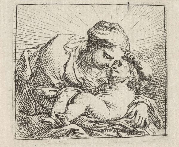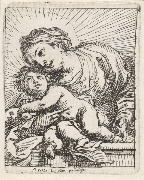 Curator: Standing before us is "Madonna met kind" by Cornelis Schut, an ink drawing dating from 1618 to 1655. It's part of the Rijksmuseum collection. Editor: The texture! Even from a distance, I'm struck by the raw, almost visceral quality of the lines. It’s very tactile, considering the subject matter. Curator: Precisely. This image offers us a poignant glimpse into the prevailing social norms and power structures embedded in religious representation of motherhood during the Baroque era. Think about the significance of Mary, not just as a mother, but as a vessel through which divine power is channeled. Editor: It is compelling, and certainly defies typical idealizations. Schut's mark-making creates this fascinating tension between the sacred and the earthy, or, you could say the divine and quotidian aspects of early 17th century material conditions and spiritual beliefs. It also highlights the handmade quality, revealing the artist's labor directly. Curator: Note how the radiating lines from behind them create an almost tangible aura, imbuing the subjects with an ethereal quality, even though their forms appear quite grounded. This contrast reminds me of the debates surrounding female agency at the time. Is she divinely chosen or subject to socio-political forces? Editor: Interesting. For me the stark contrast serves a different purpose; the material reality and even the commodity status of religious iconography comes to mind when viewing it with my particular interests. The repetitive lines feel mechanical in a way; consider the labor invested in reproducing this image and circulating it. Curator: Absolutely, thinking about reproduction provides important insights to devotional life. And while Schut uses the traditional subject, he subtly invites questions concerning gender and the construction of maternal holiness. It pushes viewers to analyze social conditions which is rare for art produced at the time. Editor: Agreed. Viewing the ink not just as a tool for representation but as evidence of work makes you question the value of skilled artistic practice and the purpose and conditions around its consumption in Baroque society. I also keep thinking about that roughhewn, unidealized feeling, even though it certainly embodies certain aspects of the Baroque. It's fascinating, almost as though there's an intentional contradiction embedded within it. Curator: These critical layers are a reminder that art engages with not only a devotional practice but also the identity and the social and cultural implications related to religion. Editor: Well said. This little drawing provides such fertile ground for discussing labor, materiality, and faith. It makes me want to look at his other works, considering similar elements!