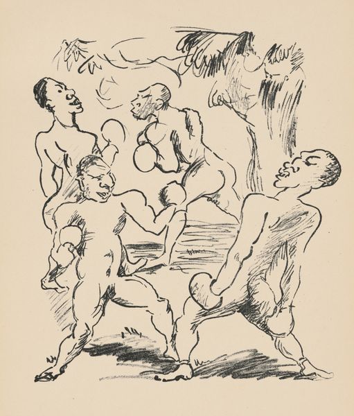 Curator: This is "Study with Three Nudes," a work rendered in ink drawing attributed to Rik Wouters. Editor: There’s a striking immediacy about it. The figures seem caught in fleeting, almost accidental poses. I particularly appreciate the strong black lines against the bare paper; it feels very direct, very raw. Curator: Wouters, known for his Fauvist paintings and sculptures, also worked prolifically with drawings, such as this. Though undated, the quick, assured strokes suggest this was a study. We can appreciate its value in exploring how nudes as subject matter reflected evolving societal attitudes, shifting away from academic idealization to something more expressive and personal. Editor: I see the economy of line contributing significantly to its expressiveness. It's not about perfect anatomical accuracy, but capturing the essence of the forms. Notice how a few strokes define the curve of a back or the drape of cloth – very effective. Curator: Absolutely. The composition subtly disrupts conventional depictions of the nude within the artistic establishment. Wouters moved freely between different artist circles in Belgium, like "De Distel," which aimed to promote art appreciation across social classes. It's worth thinking about how this and similar works may reflect his socio-political convictions regarding art’s public accessibility. Editor: The contrast-heavy monochrome lends itself beautifully to graphic simplicity but equally makes a clear study of line and light which has more visual impact than mere sketching. Do you see his involvement with “De Distel” making work that feels more relatable? Curator: In some ways yes, its sketch-like qualities and visible creation process might reflect a deliberate attempt to demystify the art making process itself to the masses. Editor: It invites us to look closely at form and function which seems to create a dialogue between process and political agenda. Fascinating! Curator: Precisely, offering us today a unique window into both the formal and social contexts shaping early 20th-century art. Editor: Agreed. It really showcases the power of minimal means. I find its immediacy incredibly appealing, prompting thoughts of not just form but also on what informs our contemporary tastes today.