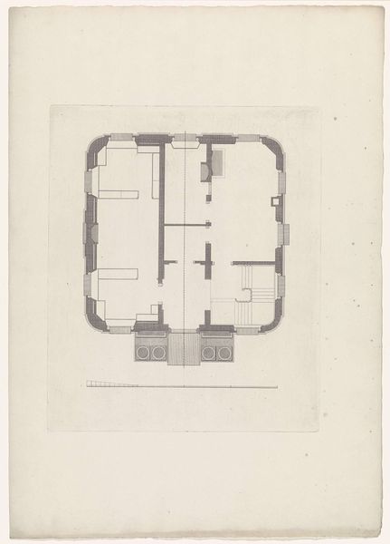 Editor: This is James Blair's "First Floor Plan" from an unknown date, held in the Harvard Art Museums. I find the starkness and precision of the lines quite striking. What strikes you about this plan? Curator: The "First Floor Plan" provides insight into the labor and processes involved in architectural design. The materials used – ink, paper – reveal a specific period and mode of production. How does the social context of this plan, perhaps its intended function, influence our understanding of its artistic merit? Editor: That's interesting, I hadn’t thought about the paper and ink as integral to its meaning. So, it’s more than just a utilitarian drawing? Curator: Precisely. Its existence reflects a specific labor division, a material investment, and a vision of consumption. Seeing it this way helps us question conventional boundaries between art and design. Editor: This has definitely changed how I see architectural drawings. Thanks!