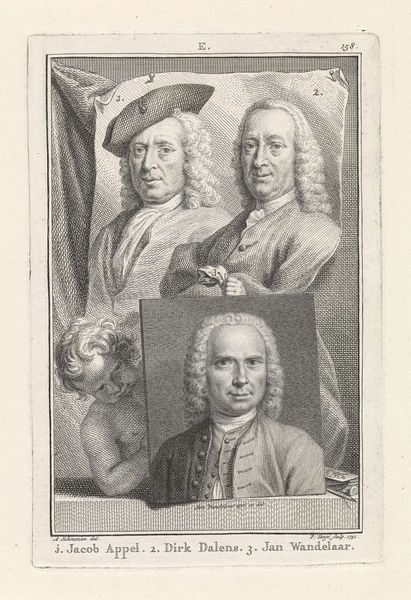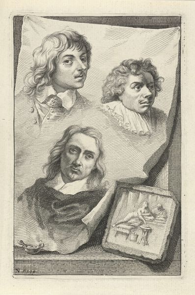 Jacob Houbraken created this print of Frans Hals, Wenzel Coebergher, Lucas van Uden, and Wybrand de Geest. It's made using engraving, a process involving meticulous carving into a metal plate, which is then inked and printed. The precision of the engraved lines is remarkable. Notice how each portrait captures the texture and character of the sitter, from the fine hairs of a beard to the folds of clothing. The density of lines creates shading and depth, defining the forms of the faces and costumes. Engraving like this requires immense skill and time. It belongs to a tradition of reproductive printmaking, where the goal is to disseminate images widely, making art accessible to a broader public. This kind of print was very much a product of its time. Prints such as these facilitated cultural exchange and the spread of knowledge, playing a crucial role in shaping artistic taste and intellectual discourse. The very act of recreating these portraits through engraving speaks to the value placed on these individuals and the desire to preserve their likenesses for posterity, which is a social context of high importance.