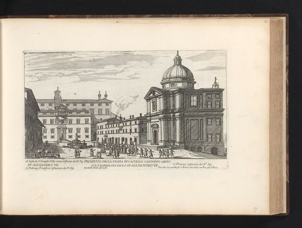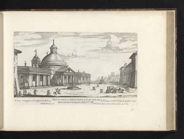This is Giovanni Battista Falda’s "Piazza della Rotonda en het Pantheon te Rome," an engraving dating back to the late 17th century. The print presents a symmetrical composition, dominated by the Pantheon's architectural mass, where the play of light and shadow creates a sense of depth. The regular geometry contrasts with the figures populating the piazza, bringing a human element to the scene. Falda skillfully employs line and perspective to create a sense of space. The meticulous details, from the texture of the building facades to the patterns on the paving stones, speak to the engraver's command of his medium. The buildings' shadows, rendered through dense clusters of lines, give form to the architectural space. The Pantheon is not merely a structure but a nexus where classical ideals of order and harmony meet the bustling life of Rome. It serves as a visual representation of a culture grappling with its historical inheritance. Notice how the artist uses structure to invite contemplation about history, space, and human experience.