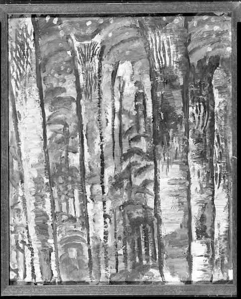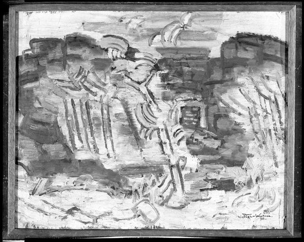 Curator: Johann Walter-Kurau's "Cubist Landscape" presents a fascinating study in grayscale, currently residing here at the Harvard Art Museums. Editor: Instantly, I’m struck by how this landscape, rendered in fractured planes, evokes a sense of both solidity and ephemerality. It’s almost like memory itself, fragmented yet persistent. Curator: The artist employs a limited palette to emphasize form and structure. You notice, of course, how traditional landscape elements are deconstructed and reassembled? Editor: Yes! The trees become geometric echoes of the buildings, blurring the lines between the natural and the constructed. It's a dialogue about the interplay between humans and their environment, reflected in stark terms. Curator: I feel a certain chill looking at this, perhaps born out of its monochrome nature. Editor: Perhaps it’s a reflection of the uncertain times from which it may have emerged; a landscape seen through the lens of turmoil and reinvention. Curator: It's hard not to see those things, isn't it? Editor: Absolutely! It seems this painting pulls us into a world that's simultaneously familiar and unsettling.
