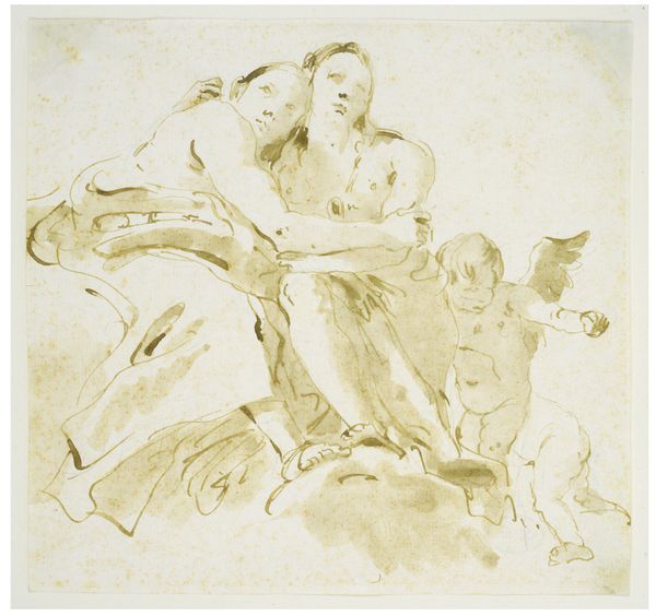 Editor: Here we have Giovanni Battista Tiepolo's "Apotheosis of a Warrior," probably created sometime between 1696 and 1770. It's an ink drawing, and my first thought is… drama! What do you see in this swirling, evocative piece? Curator: Drama, yes, and dare I say a rather stylish swagger? Tiepolo had such a knack for capturing grand gestures and operatic emotion with seemingly effortless lines. But beyond the surface spectacle, it’s fascinating to consider what "apotheosis" meant in the context of the 18th century. Is it simple hero worship? A wink at power? Something else entirely? Editor: It feels a bit ambiguous. I mean, the warrior's clearly triumphant, but the lion looks pretty miffed about the whole situation! Does that contrast contribute to the meaning, do you think? Curator: Absolutely! Tiepolo’s not afraid to mix the sublime with a touch of the ridiculous. Notice the cherubic figures practically tumbling over themselves in the lower corner. It keeps the work from becoming too stiff, too self-important. It reminds us that even apotheosis, even ultimate glory, has its chaotic, messy side. Maybe a little bit absurd, too. How does that thought resonate with you? Editor: That's a fun perspective! It almost feels like Tiepolo's inviting us to question the whole idea of glorifying war, even as he depicts it. Curator: Precisely! Art isn’t always about answers, sometimes it's about the best kind of questions. The ones that stay with you long after you’ve walked away from the drawing. Editor: Definitely given me food for thought. I hadn’t considered the subtle questioning amid the grandiosity before. Thanks for that!