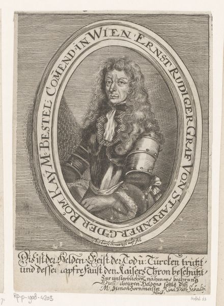 Editor: This is "Portret van Johann Jacob Pantzer," an engraving from somewhere between 1665 and 1721, by Christian Romstet. I’m immediately struck by the intricacy of the lines – it's so detailed, particularly the lace and the hair. The oval frame adds to the formality. What elements jump out to you? Curator: Initially, observe the formal rigor. The composition's central element, an oval portrait, embodies classical restraint, contrasted against the detailed textures. Focus on the tonal gradations, a delicate choreography of light and shadow that structures the figure. How do you interpret the artist's conscious manipulation of depth? Editor: Well, the framing within a frame definitely emphasizes the subject, pushing him forward. And the darker shading around his face gives him weight. But is there something more to say about this use of visual space and dimension? Curator: Indeed, consider the spatial dialectic: The shallow depth of field within the oval contrasts with the inscription below, which introduces a planar complexity. Further, note the figure’s hand. See how it interrupts our view, complicating the picture plane? Editor: Ah, yes, now I see the dynamic between the subject's personal space and the viewer's perspective is more complicated than I originally understood. The lines create a conversation. I hadn’t appreciated how the composition, depth and structure all contribute. Curator: Precisely. And such observation provides the key for unlocking its internal discourse.