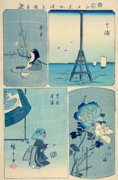 Editor: This blue-toned woodblock print, "Cutout Pictures of Famous Places in Edo" by Utagawa Hiroshige, presents several scenes in one frame. I'm struck by the variety of textures achieved through the printmaking process. What do you see in this work? Curator: The materiality of this print is crucial. Consider the woodblock—the labor, the skill required to carve it. The choice of pigments, likely affordable and readily available, speaks to the consumption of art in Edo society. How does the printmaking process itself inform your understanding of these "famous places"? Editor: That's interesting. I hadn't considered how the means of production might democratize access to these landscapes. Thanks for that perspective!