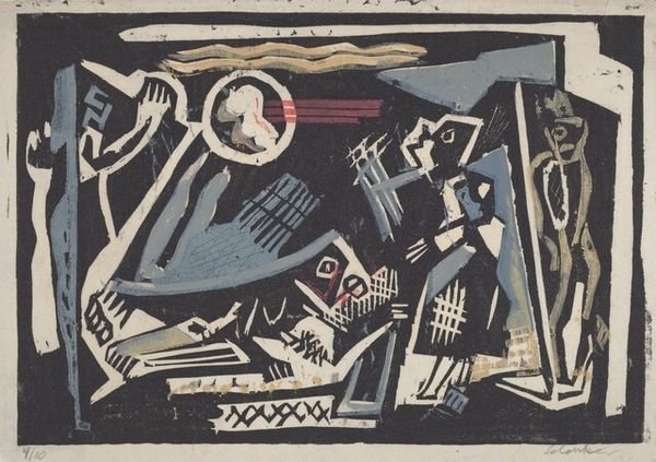 Editor: Looking at Sándor Bortnyik’s drawing, *The Dancer*, in ink on paper, what strikes me is how angular it is. It's like a scene from a very stylish, slightly chaotic jazz club. What do you make of it? Curator: As a materialist, I am immediately drawn to the use of ink itself. The stark contrast, the bold lines... Ink was an inexpensive and easily accessible medium. Do you think the choice of ink was intentional, perhaps reflecting the social circumstances or accessibility of art during the interwar period? Editor: That's interesting. I hadn't considered the socioeconomic aspect. The ink does give it a very immediate, raw feel. Could the geometric forms, those fragmented shapes, also be speaking to the fractured social and political landscape of the time? Curator: Absolutely. Think about the mass production influencing daily life, the changing urban environment; those sharp angles could very well be visual metaphors for that rapid transformation and the social anxieties accompanying it. Are we looking at leisure and consumption, a rejection, or a reinterpretation, of "high art" forms and themes? Editor: It’s certainly not the idealized form you'd see in traditional academic art. I see more than one nude, the cityscape outside the window. I like how it depicts everyone inside too: drinkers, dancers and musicians. Curator: What implications do those methods of production and modes of display have on our interpretation? Does this break with convention open it up to new audiences, or does the association with a "lower" material diminish its perceived value? These choices offer very unique insight. Editor: Thinking about it now, the "cheapness" of ink challenges assumptions about value and accessibility. It allows for wider creation and dissemination. It wasn't just about aesthetics but about democratizing art-making itself. Curator: Exactly! Considering art through its materiality – ink, paper, the labor involved – brings it down to earth. A truly revelatory discussion.