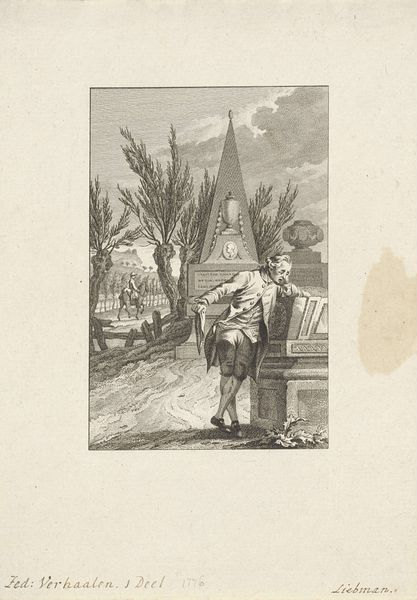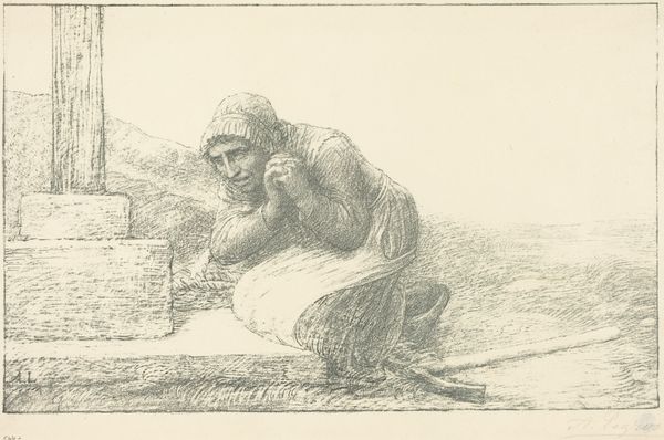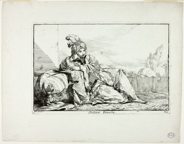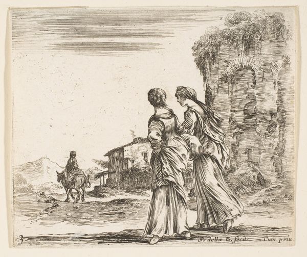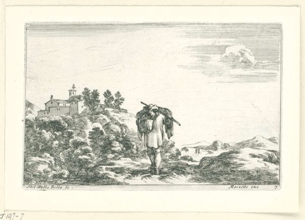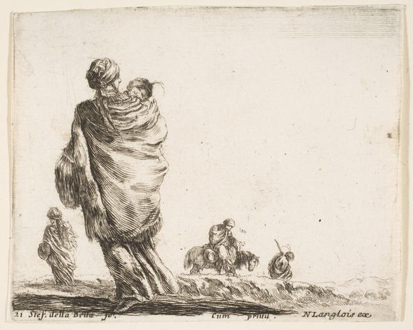 Curator: Let’s explore "Boerin met mand," or "Farmer’s Wife with Basket," an etching dating roughly from 1620 to 1664, by Stefano della Bella. It resides here at the Rijksmuseum. Editor: My first impression is of tranquility and stillness. Despite the figure in motion, the etching’s monochromatic simplicity and sparse composition create a quiet, almost melancholic atmosphere. Curator: It certainly evokes a feeling of simpler times. The figure, presumably the farmer’s wife, appears dignified, her gaze directed forward with purpose, but she's also an archetype. I wonder what contemporary viewers read into this image of rural life. Is it a nod to tradition, a representation of perseverance? Editor: From a formal perspective, note how the lines create form and depth, particularly in the woman’s clothing and the texture of the trees in the background. The use of light and shadow, albeit subtle, guides the eye across the composition. See how her garment drapes to indicate the load she's carrying. Curator: Exactly. It reflects the baroque period's appreciation for realism blended with symbolism. The basket, obviously, is central. Baskets recur across centuries in artistic and ritual contexts, often linked to harvest, bounty, and, more symbolically, the burden or responsibility that women are expected to bear within agrarian society. Editor: Interesting, because compositionally, it is cleverly balanced. The darker details are more forward, close to our viewer, which in turn emphasizes her journey forward to that horizon. Curator: Right, and even the second, much smaller figure walking in the background. He serves as contrast to the primary figure—her scale, stance, posture suggests an entirely different approach. This tension speaks to our shifting understanding of land and labor. Editor: A fruitful analysis. Examining its structure illuminates the subtle ways in which simple lines can convey such profound meanings and moods. Curator: Indeed. Considering those shifting readings through time only amplifies how rich even seemingly simple etchings can be.