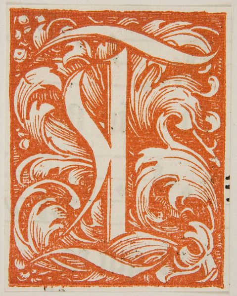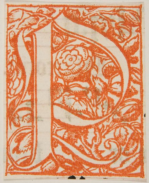 Curator: This is "Letter R," an anonymous print now residing at the Harvard Art Museums. Editor: The texture! It looks like rust, almost like it's decaying, or maybe printed from a very worn block. Curator: Exactly. As a print, it embodies a specific mode of material production and distribution, challenging notions of unique artistic creation. Consider the labor involved in carving the block, the type of ink used, and the paper itself. Editor: I'm interested in its circulation and social function. How were these prints used? Who had access to them? Was it part of a larger series, an alphabet perhaps, contributing to literacy or decorative practices? Curator: Potentially both! These kinds of initial letters served a function within a larger system of the written word, highlighting the importance of text and information dissemination in society. Editor: Right. We can see the early printing press democratizing letterforms, which had previously been the domain of scribes and illuminators. It reflects a society in transition. Curator: Absolutely, and appreciating the materiality helps us unpack this transition. Editor: It makes you wonder who made the print and why.