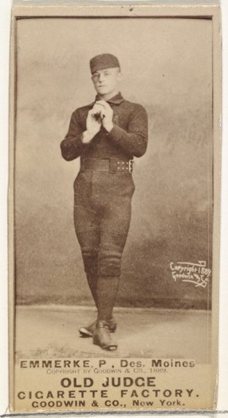 Curator: Looking at this piece, I’m immediately drawn to the quiet melancholy of it. The sepia tones give it this hazy, dreamlike quality, like a faded memory. Editor: That's beautifully said. Let’s contextualize that feeling a little bit. Here we have "Robert Emmerke, Pitcher, Des Moines Prohibitionists," a card from the "Old Judge" series for Old Judge Cigarettes, dating back to 1889. The cards were produced by Goodwin & Company, of course, and you can see an example right here at the Metropolitan Museum of Art. Curator: Prohibitionists and cigarettes! The irony is delicious! Editor: It speaks to the contradictions inherent in marketing, even back then. It also makes me think about the target audience. Who were they trying to reach with images like this? It clearly touches on baseball mania during the late nineteenth century. Curator: Right, the emerging culture of fandom is critical here, and we have to address race as well. Although a formal segregation prevented players of color to appear on teams, their presence haunts the image. What exclusions make this man “heroic?” Editor: Hmmm… I think also it's fascinating how photography, only relatively new, was already being used in commercial art this way. How a posed image could build a story. What stories were sold? What got cropped? It also reveals the era’s perception of athletes; the roughhewn physique. How different that feels today! Curator: Indeed. This image also opens up avenues to explore ideas about masculinity. Notice Emmerke's controlled stance—but even more so, look at that baseball about to smack his helmet! This links it to wider discourses about sporting prowess as intertwined with power, respectability, even ideas about manifest destiny… Editor: Yeah, it all leads back to constructing particular social ideals, I suppose. So what's your takeaway from "Emmerke," after giving it some thought? Curator: This unassuming little card is a microcosm of late 19th-century American anxieties and aspirations made palpable, wouldn’t you say? A neat synthesis. Editor: Perfectly so! An unexpected curveball of social history delivered through a sepia-toned photograph and tobacco advertising. Quite potent!