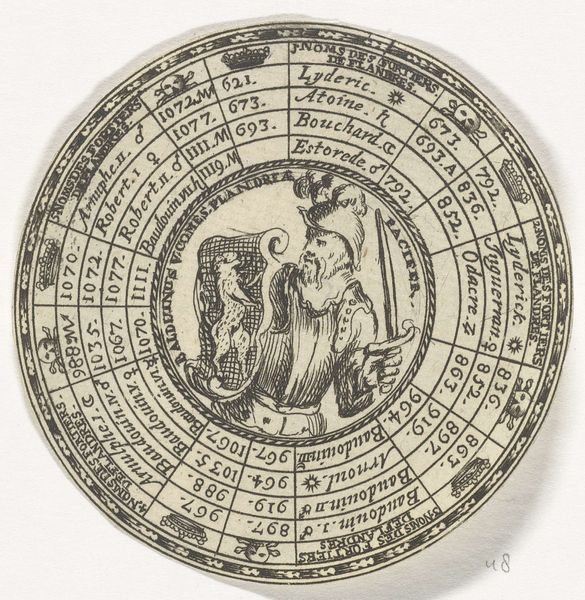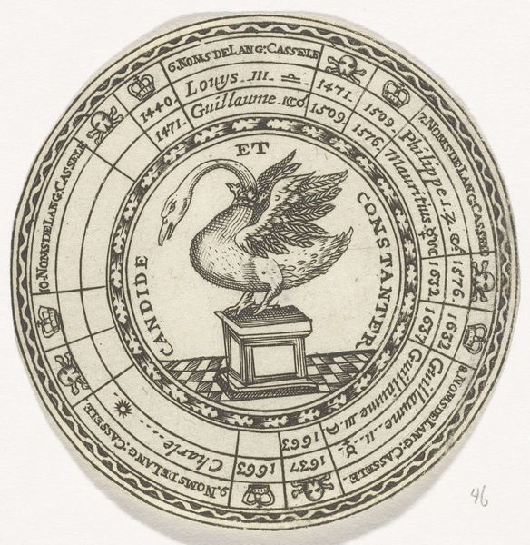 Curator: Here we have an engraving dating from the early 18th century, sometime between 1706 and 1720 to be precise. It's an commemorative medal—"Penning van de Universiteit Groningen, met ruimte voor de namen van de hoogleraren en wapen van de universiteit" is the title— essentially a University of Groningen medal with space for the names of professors and the university coat of arms. Editor: It strikes me immediately as a piece meticulously constructed. The circular format is almost clock-like. The sheer amount of textual information is also very eye-catching! Curator: Yes, the names of the professors and their start dates are inscribed around the perimeter within that circular boundary. The engraving technique itself is quite fine; consider the time and labor involved. It surely would have taken considerable planning, as each one had to be hand-crafted and printed one at a time. Editor: True, the social function is crucial. These kinds of medals likely signified not only academic achievement but were also badges of the institution. Note the placement of the coat of arms and personification of 'virtus' or virtue. It all points toward creating and broadcasting a powerful image of academic legitimacy. Curator: That's right. And considering the socio-political environment of the time, with various competing academic institutions, presenting this image of legitimacy, of history, would have been vitally important to the university's identity. The distribution and the possession of these medals was likely restricted to scholars or other dignitaries who helped to build Groningen’s renown. Editor: Looking again, the lines radiating from the center almost mimic a radiating sun. It's Baroque classicism, rendered as an industrial artifact made for the purpose of celebrating higher learning! It makes you consider who was actually represented by this visual, and how far its effect reached beyond the privileged academic class who benefited. Curator: Exactly, it prompts us to think more deeply about how symbolic power is made visible through labor. Editor: And it reveals how formal visual order reinforces a vision of social order. Thank you, that was very enlightening!