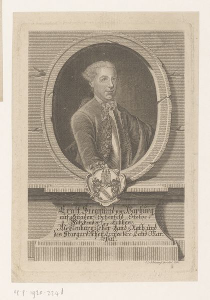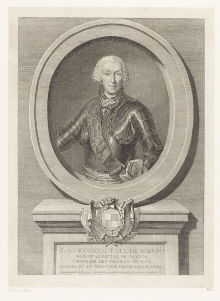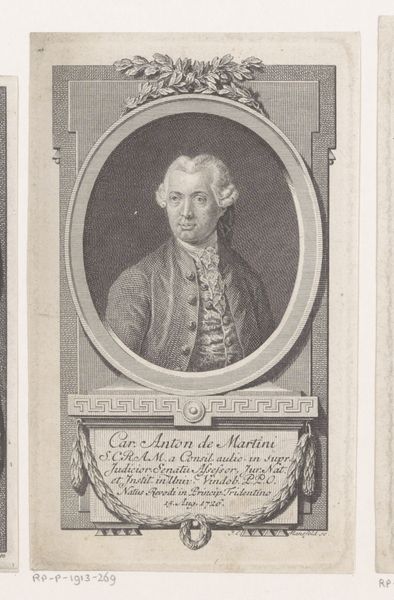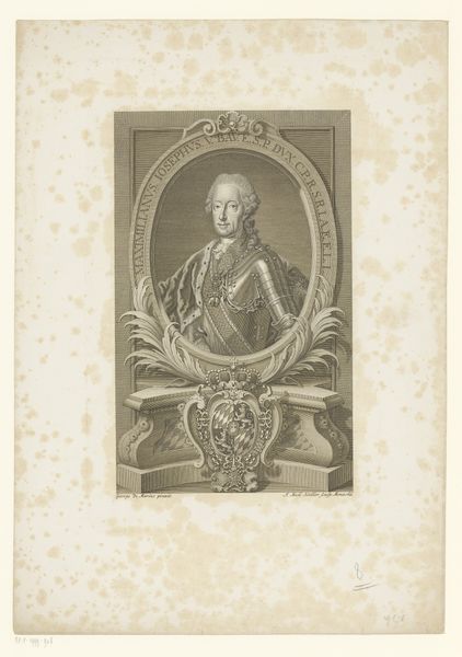 Editor: We're looking at a print titled "Portret van Karel Emanuel III, koning van Sardinië," created between 1735 and 1745 by Carlo Domenico Melini. It's an engraving. What I notice first is how the composition uses frames within frames, like the oval border and then the rectangular scene at the bottom. What strikes you most about this piece? Curator: Indeed, the framing is key. Let's observe the deployment of semiotic forms: The oval portrait above contrasts sharply with the horizontal rectangle of battle beneath. How does this layering impact our understanding of power, as it's visually represented? Is the lower battlefield purely an ornamental afterthought or a metonym of rule? Note too how realism in detailing—see the rendering of garments—serves to underscore the Baroque flamboyance surrounding the portrait itself. Editor: That's fascinating. It sounds like the form tells a story. What do you make of the empty space on the print around the portrait? Curator: That "negative space," is not truly "empty." It serves as a structured void which amplifies the portrait by its mere adjacency. Look to structuralist analysis for deeper interpretations here; observe the interplay of linear structures—garlands, vertical shafts, rectilinear frames against organic foliage and curvature of royal garments. Does Melini consciously craft visual discordance? Editor: So, the relationships between the forms and textures create meaning beyond just the literal image of the king? Curator: Precisely. Reflect on what remains unsaid by such careful curation of surfaces, textures, and formal arrangements: a complex system of signs exceeds simplistic representation! Editor: I never considered the visual language in such depth before. Thank you! Curator: A painting can always be broken down. We discover more when its language of signs can be spoken fluently.