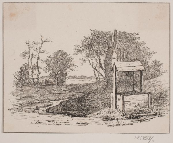 Editor: This is "Kilden. Illustration til Kaalunds 'Fabler for Børn'," or "The Spring. Illustration for Kaalund's 'Fables for Children'," a pen and ink drawing on paper by Johan Thomas Lundbye from 1844. I am immediately struck by the stillness in this rural scene. The crispness of the line work, the quiet composition—it all evokes a kind of hushed reverence. What elements of the piece strike you as most significant? Curator: The formal composition is quite intriguing. Consider how the artist leads our eye. We enter at the well, then trace the subtle path receding into the landscape, toward a horizon barely articulated. It demonstrates a careful balancing of positive and negative space. Editor: So you are seeing a deliberate organization of elements, even in this seemingly simple scene. Curator: Precisely. And note the quality of line. The fineness and precision with which the well is rendered contrasts beautifully with the more loosely defined foliage and distant trees. Do you notice any specific techniques that create this distinction? Editor: I see how the thicker lines give form to the well itself, while the delicate, almost feathery strokes define the natural world around it. That adds to the sense of quiet, like the scene is barely touched by human activity outside of the construction of the well. Curator: Yes, exactly. Lundbye expertly utilizes contrast and variation in line weight to define forms and create depth. There's a dialogue occurring between the geometric form of the well and the organic forms of nature. Editor: So much is happening with just ink and paper. Looking at this, I now appreciate how strategic line work can be in establishing space and creating balance in what initially appeared to be an everyday pastoral scene. Curator: Indeed. Through meticulous observation and skillful rendering, Lundbye elevates a simple spring into a study of form, texture, and spatial relationships. It invites us to consider the art of seeing itself.