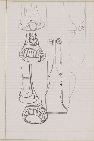 Curator: Gerrit Willem Dijsselhof, around 1901, rendered this work, "Tafelpoten en ornamenten," in pencil and perhaps a bit of ink. It currently resides at the Rijksmuseum. My first thought? It feels unfinished, raw. Editor: Precisely. There is a beautiful economy of line in the quick studies—pure form distilled onto the page. Look at the geometric breakdowns alongside the flourish of the ornamentation. It seems a clear push and pull between structure and embellishment. Curator: That tension absolutely mirrors broader societal anxieties of the time, particularly anxieties around labor and production. The Arts and Crafts movement, with which Dijsselhof was affiliated, critiqued industrialization's alienation of the worker from their craft. He was looking to elevate craft by demonstrating it as valuable intellectual property for a growing and increasingly class-based art consumer market. Editor: You're drawing out the social implications of something I saw more formally. These initial strokes are intriguing, and while, yes, we can contextualize within a social and political movement, at face value, each is such an individual formal experiment. Dijsselhof plays with symmetry, asymmetry, proportion. I love that one can visually deconstruct this as an architecture in its own right—ideas scaffolding a future. Curator: Absolutely. Dijsselhof's embrace of both geometric precision and free-flowing ornament suggests an attempt to reconcile tradition with modernity, much like we are, standing here talking about his sketchbook! Consider that his design ethos centered a belief in art's capacity to impact the lives of all, thus providing a moralizing component of domestic environments and elevating design and craftsmanship. Editor: And through this sketch we, now, almost one hundred years later, find beauty, intentionality and ultimately see Dijsselhof trying to define what would aesthetically bring harmony to functional and beautiful design. The purity of these initial designs are striking. Curator: I find myself considering these lines—almost like traces, artifacts that mark the beginning of a tangible effort to affect and enrich our shared everyday reality. Editor: I'm leaving this conversation seeing lines—lines not only forming, delineating, representing the design of potential future furnishings but a distillation of how geometric form has an intrinsic balance.