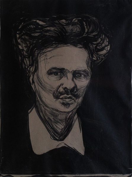 Editor: This is Edvard Munch's portrait of August Strindberg. The stark contrast and scratchy lines give it such an intense feeling. What do you see in this piece? Curator: I find the lithographic technique particularly compelling. Note how the artist uses the density and directionality of the lines to create form and texture. Do you see how the hatching around the eyes gives them a sunken, almost haunted quality? Editor: Yes, it’s like he’s peering out from the darkness. It’s all in the lines and the way they are arranged. Curator: Precisely. It is through these formal elements that the artist conveys psychological depth. Editor: I never thought about it that way. Thanks for pointing that out. Curator: My pleasure. Analyzing these fundamental components reveals so much.