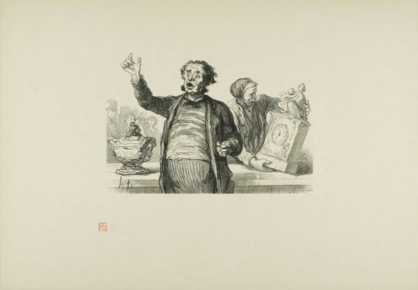 Curator: What an energetic scene! So many figures, all tightly packed. You can almost hear the buzz of the crowd. Editor: Absolutely. Let’s consider “The Auction House: The Auctioneer.” This print, made by Charles Maurand sometime between 1863 and 1920, depicts exactly what the title suggests—an auction. We see an auctioneer mid-call, holding his gavel high, with a sea of faces gazing up at him. Curator: The faces! They’re a real mix, aren't they? What do we read in their expressions? Hope, greed, anticipation? It seems very class-based. Everyone has a hat and dark coats. It strikes me how economic status shaped access to these cultural and commercial spaces, who participates, and even whose image gets reproduced in art. Editor: It's interesting you note that—that reading resonates strongly. Look at the technical execution too, all these fine lines layered upon layered upon layer. And that leads to process: It must have taken hours to engrave this image. Someone designed, someone engraved, and someone else had to physically run the presses to produce the image. And it’s all done on paper, something once valuable. What do all those choices convey, not just materially but in terms of the work, the production needed to share an image like this? Curator: It really makes you consider labor, both artistic and more broadly in this context of exchange and value. Does this make art complicit in systems of economic disparity or a vehicle to resist them? Can you explore these ideas through your own relationship to production of art, in both physical terms, and the means with which you disseminate this art? Editor: Absolutely! And where this scene took place impacts what was consumed—what were these bidders looking for? Did it offer them power in that acquisition? Were these the elite of the era making capital? I am so intrigued to delve into the details. Curator: Yes! This print leaves me pondering not just who is included, but also those excluded from this world of art and commerce. Editor: For me, the art lives on in how that scene made an object of art that made these things circulate and live on to this very day.