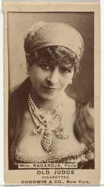 Editor: This is a photographic print titled '[Actress wearing ornate cap]' made by W. Duke, Sons & Co. sometime between 1890 and 1895. It's such a soft, faded image. What stands out to you in this portrait? Curator: I think it is key to remember that W. Duke, Sons & Co. was a tobacco company. This wasn't just a portrait, but part of a larger series used as advertising inserts in cigarette packs. These images often served to associate smoking with sophistication and the glamorous world of theatre. Think about who was excluded from this vision of "high culture"? Editor: That's interesting; I didn't consider the marketing aspect. How might the series play into the representation of women at that time? Curator: This image, and others like it, romanticized and objectified women, especially actresses. This positioned them as commodities to be consumed, not unlike the cigarettes they were promoting. This is part of a larger conversation regarding women in the workforce, especially actresses. What this portrait is *not* showing us, is a lot of their professional and private experiences. Editor: So it's more than just a pretty picture; it’s part of a system? Curator: Precisely. And that system reinforces power dynamics of gender and class that extend beyond the frame of the photograph. Advertising such as this helped dictate acceptable images of femininity, all in the service of commerce. How might it shape consumers' ideas? Editor: I never really thought of the connection between advertising, art, and cultural norms in this way. It gives me a lot to consider moving forward. Curator: Me too.