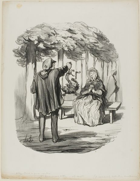 Honoré Daumier created this lithograph, “Youthful Memories,” as part of his “Married Life” series. It captures a moment of sentimental, perhaps deluded, longing. Daumier lived through a period of immense social change in France. The series “Married Life” uses humor to reveal the complex, often contradictory, expectations placed on men and women in marriage during the 19th century. In this scene, we see an older couple in a forest, the man points to initials carved into a tree, reminiscing about a past romance. The woman urges him to be quiet, fearing they will be overheard. The print suggests how gender roles shape personal experiences. The man appears lost in idealized memories, while the woman is concerned with social appearances and the present reality of their age. Daumier’s work invites us to reflect on the ways societal norms impact our intimate relationships and individual identities. What do we lose and gain as we move through life and love?