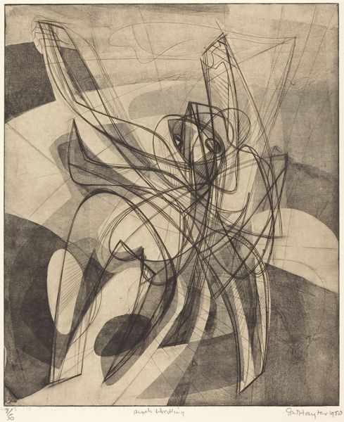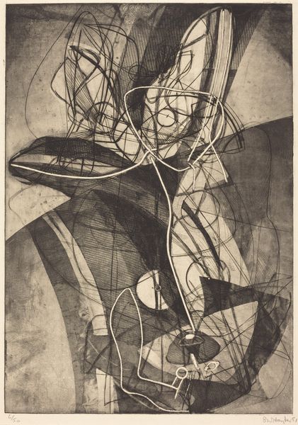 Dorothy Dehner created "The View from Palomar" in 1958, using etching on paper. The composition is dominated by a play of geometric forms—lines, rectangles, and curves—rendered in stark black against a textured gray background. The density of these shapes creates a visual tension, almost as if the forms are suspended in a delicate balance. Dehner's work invites us to consider how abstract forms can evoke spatial and emotional responses. The arrangement defies traditional perspective, challenging our perception of depth. Instead, the artist uses a semiotic system of signs, where each shape functions as a signifier, hinting at unseen structures, rather than depicting a literal view. This recalls the theories of structuralism, where meaning is derived from the relationships between elements within a system. Notice how the artist destabilizes the conventional notion of landscape. The etching functions not just as an aesthetic object but as a philosophical statement, prompting a re-evaluation of how we perceive and interpret the world around us.